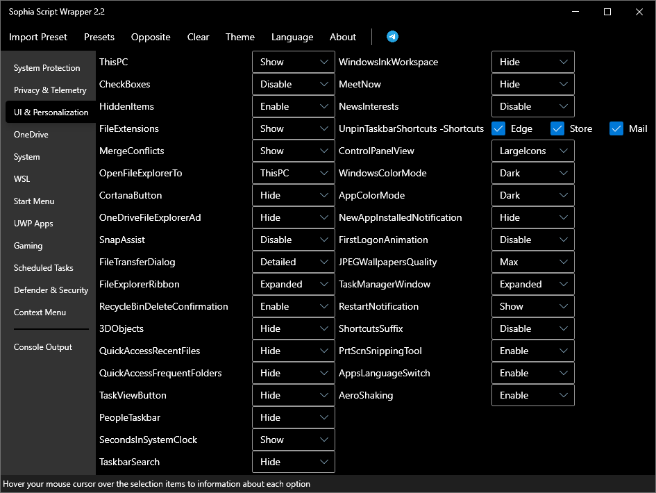 Windows10FileExplorer-EnableFileExplorerCompactMode -DisableSnapAssistFlyout -DisableTaskbarAlignment -LeftTaskbarSearch -HideTaskbarWidgets -HideTaskbarChat -HideNotificationAreaIconsTaskbarSize -SmallDefaultTerminalApp -WindowsTerminalDNSoverHTTPS -EnableWindowsTerminalContext -HideSophia Script Wrapper 2.2